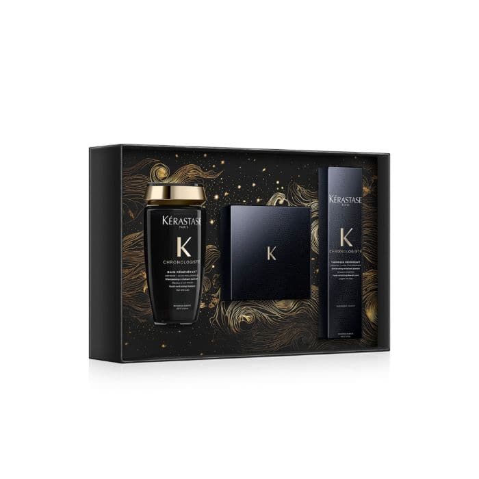 De Kérastase Chronologiste Mask Holidays Set is het perfecte cadeau voor wie zijn of haar haar wil revitaliseren en herstellen. Deze luxe Limited Edition set bevat de Bain Régénérant shampoo (250 ml), het Masque Intense Régénérant masker (200 ml) en de Thermique Régénérant hittebeschermer (150 ml). Ideaal voor elk haartype dat behoefte heeft aan anti-aging verzorging en extra voeding.