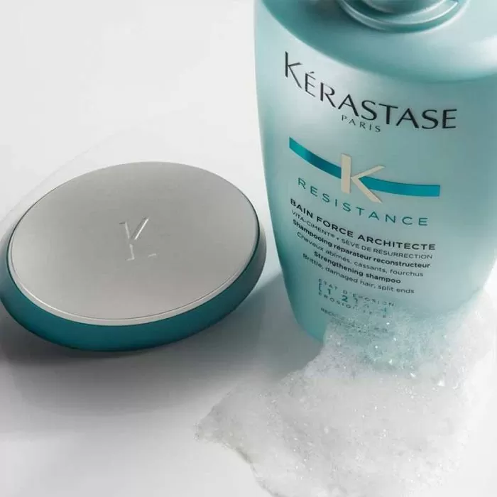 Kérastase Résistance Bain Force Architecte Shampoo is een versterkende, herstellende shampoo voor breekbaar, beschadigd haar met gespleten haarpunten. De shampoo helpt bij het herstellen van de haarvezel en gaat splijten van de haarpunten tegen. Kérastase Résistance Bain Force Architecte Shampoo geeft het haar een natuurlijke glans en een zijdezacht gevoel. De shampoo herstelt de haartextuur en reinigt het haar intensief. De shampoo gaat breekbaar, zwak haar tegen.
