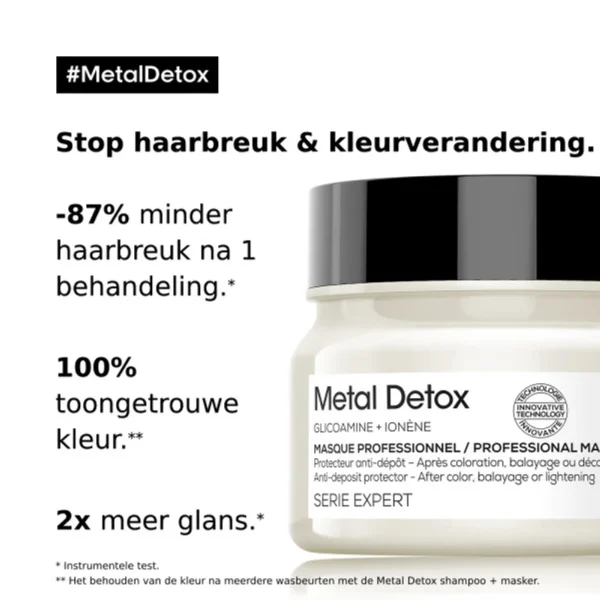 Na gebruik van de L’Oréal Professionnel Serie Expert Metal Detox Haarmasker is het haar gevoed, gehydrateerd, glanzend en beschermd. Het risico op haarbreuk is met 87% verminderd en je hebt een 100% betrouwbaar kleurresultaat.